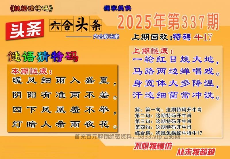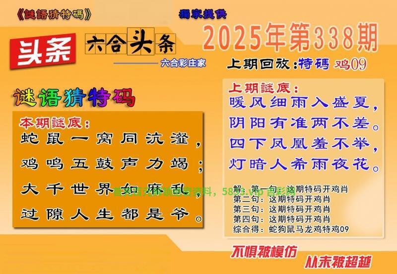 337期 暖风细雨入盛夏 阴阳有准两不差 四下凤凰羞不举 灯暗人希雨夜花 解译:暖风细雨入盛夏指风肖兔虎龙,灯暗人希雨夜花指夜肖猪狗鸡虎牛鼠 九肖:兔龙猪狗鸡虎牛鼠羊 六肖:兔龙猪狗鸡虎 |